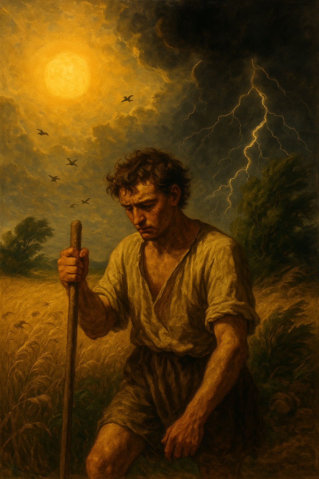 “타는 태양 아래, 새들만이 지친 듯 울고 있다. 들판도, 가축도 활기를 잃었다. 양치기는 다가올 폭풍에 불안에 떤다.”
