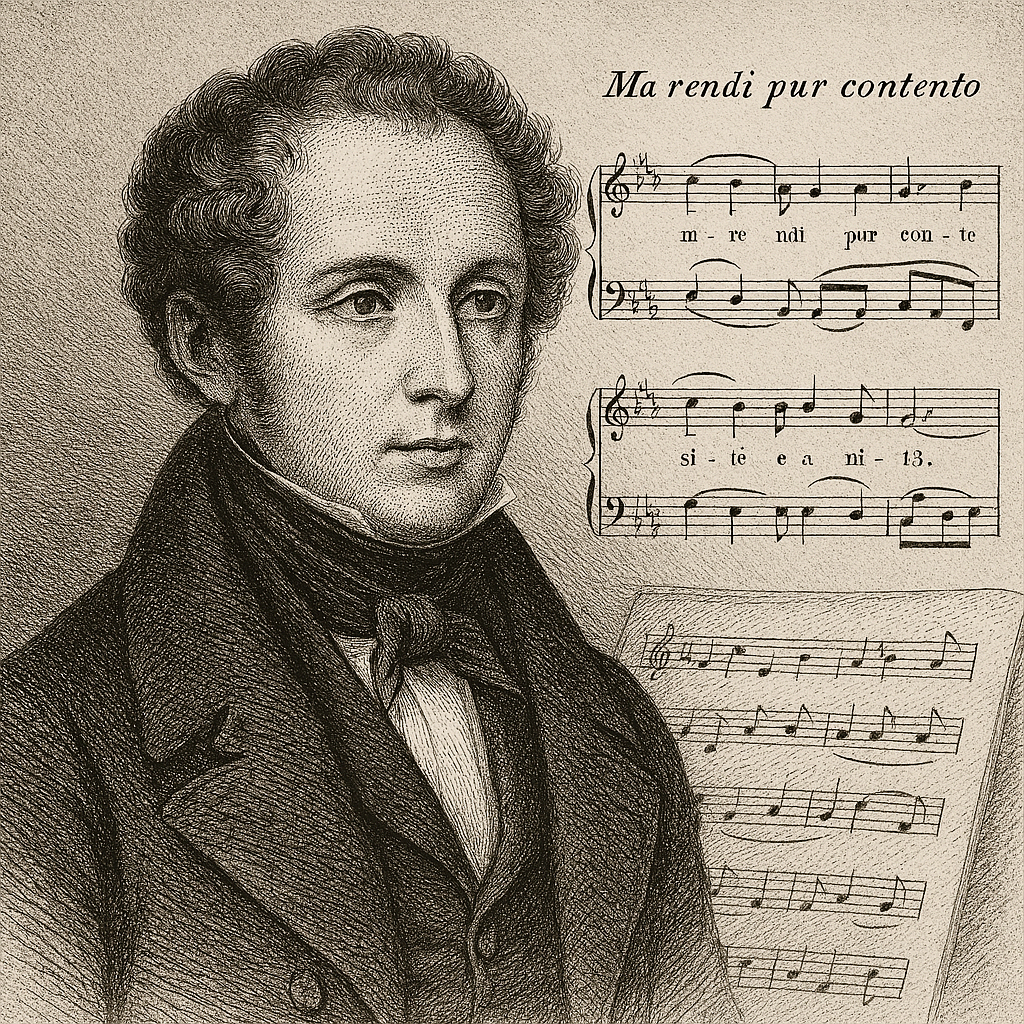 벨리니 가곡 중에서도 「Ma rendi pur contento」는 그의 진가가 돋보이는 작품이다. 이 곡의 가사는 이렇게 말한다. "그녀만이 행복하다면 나는 만족하리라." 이 노래의 가사내용은 사랑의 소유가 아닌 타인의 행복을 바라는 헌신이 주제이다. 이 곡의 선율은 단순하고 절제되어 있으나, 그 안에 담긴 감정은 매우 깊고 따뜻하다. 노래를 듣는 이의 마음을 격하게 흔들기보다는 잔잔한 파동처럼 울려 퍼지는 감정의 정제된 표현이 오히려 더 진한 감동을 준다. 이 곡은 테너, 바리톤, 소프라노 등 다양한 음역으로 편곡되어, 리사이틀이나 오디션에서 자주 불리고 있다. 이 곡의 피아노 반주는 과하지 않게 노래를 감싸며, 성악가의 해석과 감정 전달을 돋보이게 한다. 한국에서는 번역 가곡으로도 널리 알려져 있어 클래식 애호가들에게 익숙한 레퍼토리이다. 개인적으로 이 곡의 서정성에 매번 감동받곤 한다.