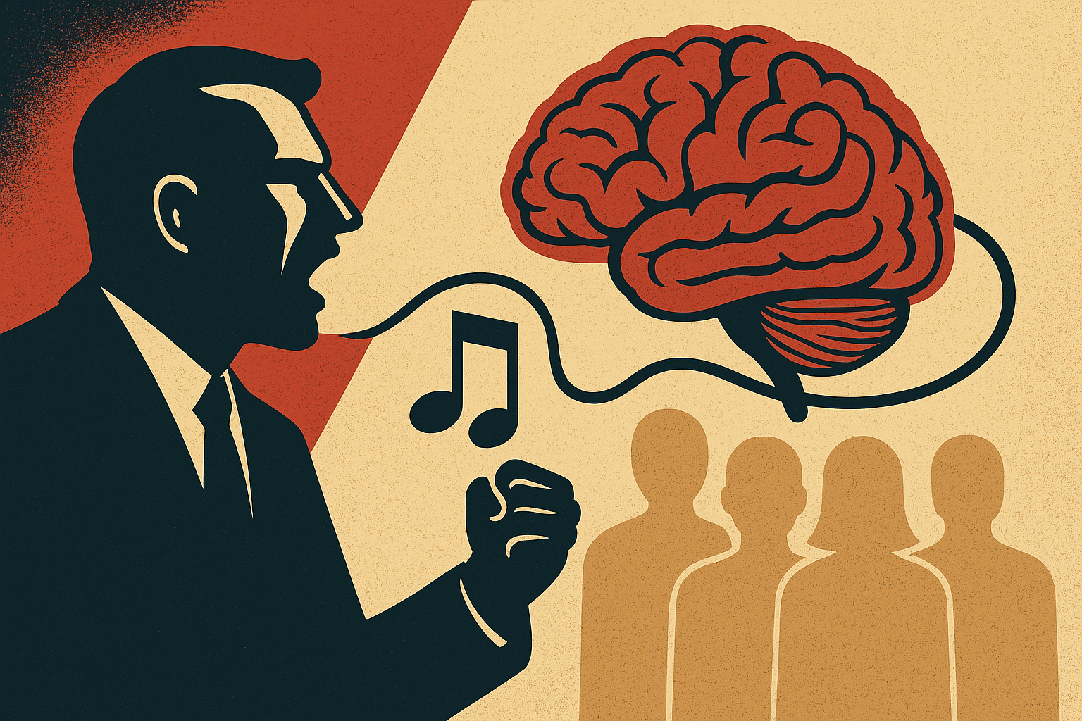 정치선전과 음악이 결합하여 사람들의 심리적 조작을 표현한 뇌 이미지