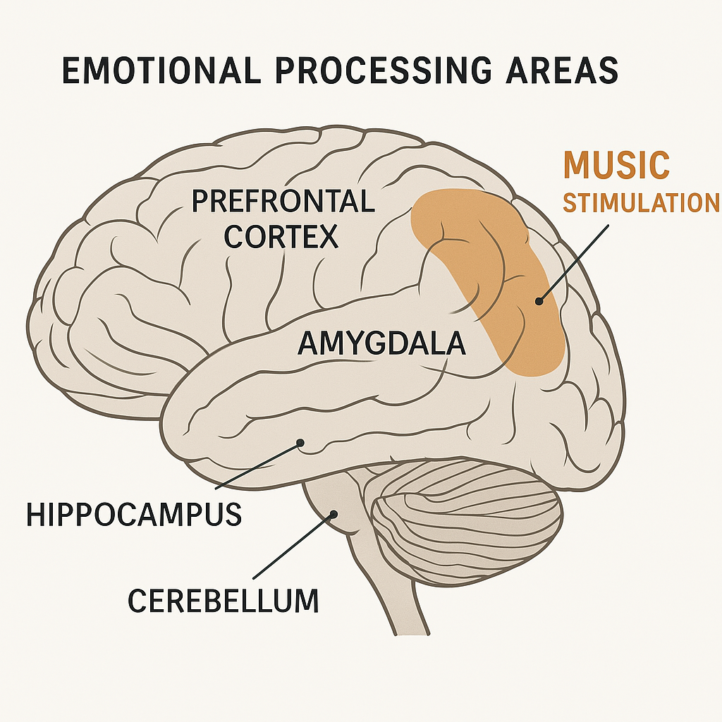 음악은 **자율신경계와 뇌의 감정 처리 부위(편도체, 해마, 전전두엽 등)**를 자극한다.
